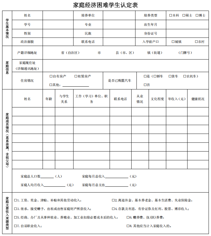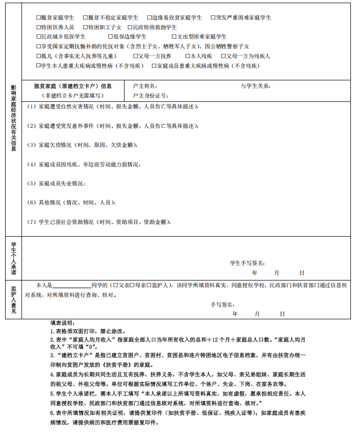 导航痕迹 党委学生工作部 下载中心 中山大学家庭经济困难学生认定申请表 扫描此二维码分享 中山大学家庭经济困难学生认定申请表 发布人:学生资助管理办公室 发布日期:2025-04-28 家庭经济困难学生认定表.docx